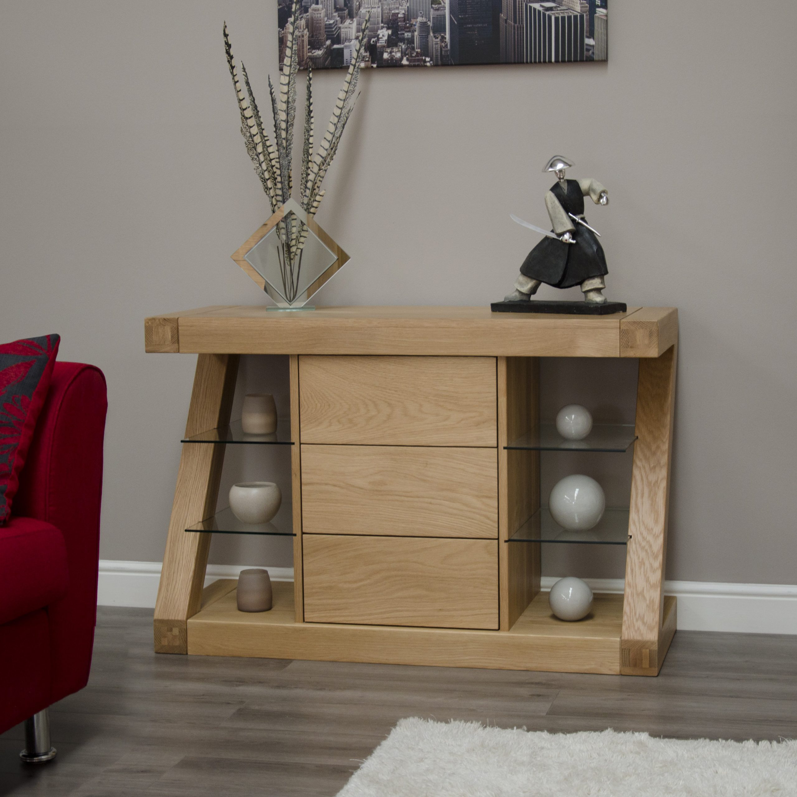 If you love clean lines, high-quality materials, and thoughtful design, this Z Solid Oak Small Sideboard is for you. It’s more than just storage – it’s a bold style statement. The clear lacquer finish adds sheen while protecting the wood, and the glass shelves provide an airy contrast to the oak’s warm, natural tones.
