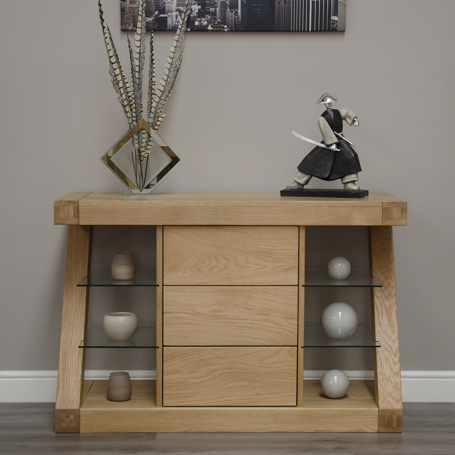 Crafted from 100% solid oak with no veneers, this compact Z Solid Oak Small Sideboard offers superb quality and enduring strength. The central section houses three spacious drawers with smooth push-to-open mechanisms, flanked by four sleek glass display shelves – perfect for showcasing glassware, collectibles, or books while keeping your living space tidy and stylish.
